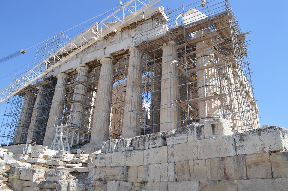 Built between 447 and 432 BC, the Parthenon was dedicated to the Greek goddess Athena, the city’s patron goddess. Inside this temple was the massive statue of the goddess, made of Ivory and Gold, by Pheidias (whose name will come up again later). After the decline of Athens and Greece the statue was sent to Constantinople (Istanbul today) where it was melted down. The temple, over the centuries, was used as a Christian Church during the Crusades and a Mosque when Turkey ruled Greece. Heavy damage was done to the temple when the Turks used the Parthenon to store gunpowder, and it went off. Restoration has been ongoing since 1980.