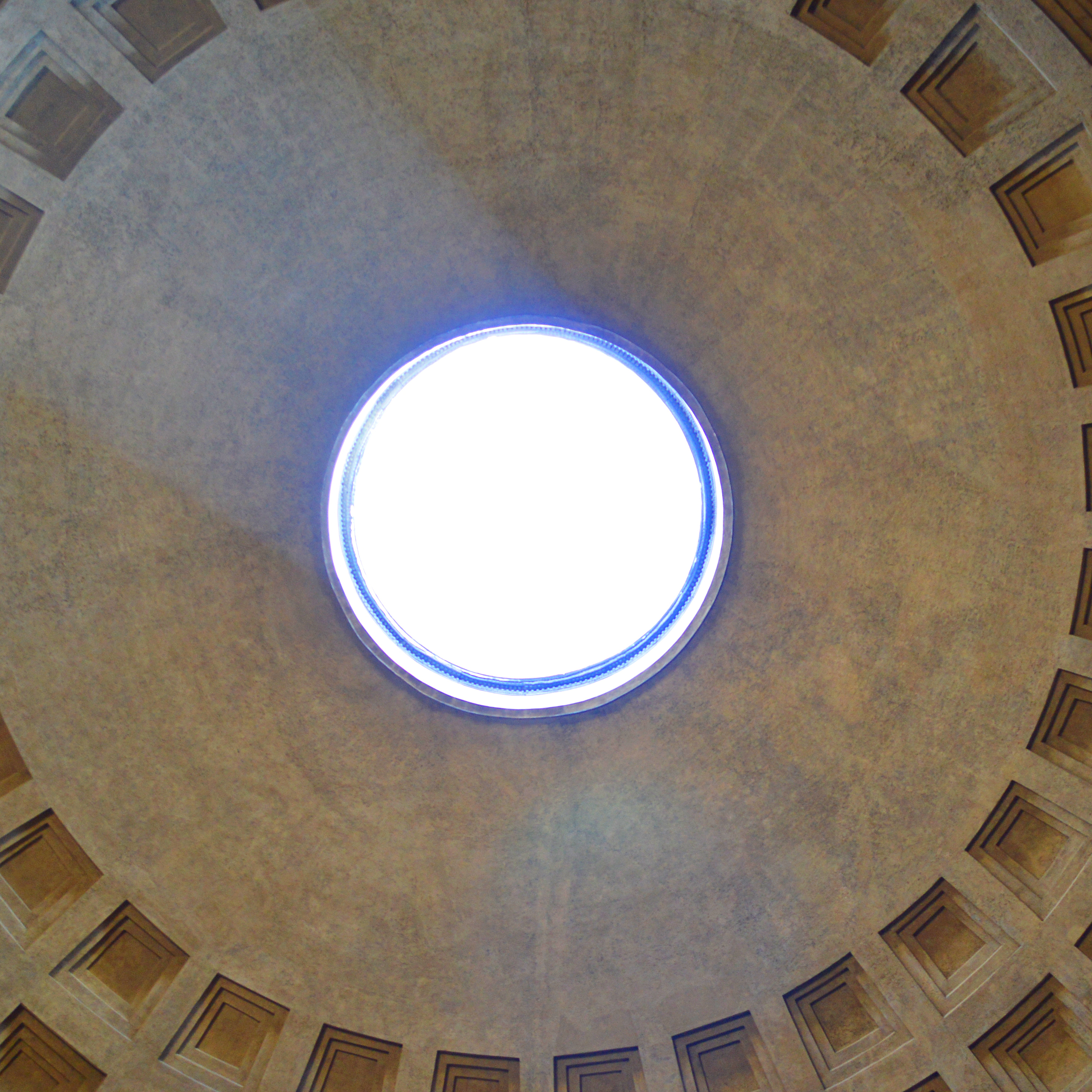 This hole, which is open to the sky and almost 29 feet in diameter, is called an Oculus (sky) and is the only source of light inside the rotunda. Even with this sizable hole in its roof, rain very seldom falls in, and if it does, the floor is slanted to drain the water.
