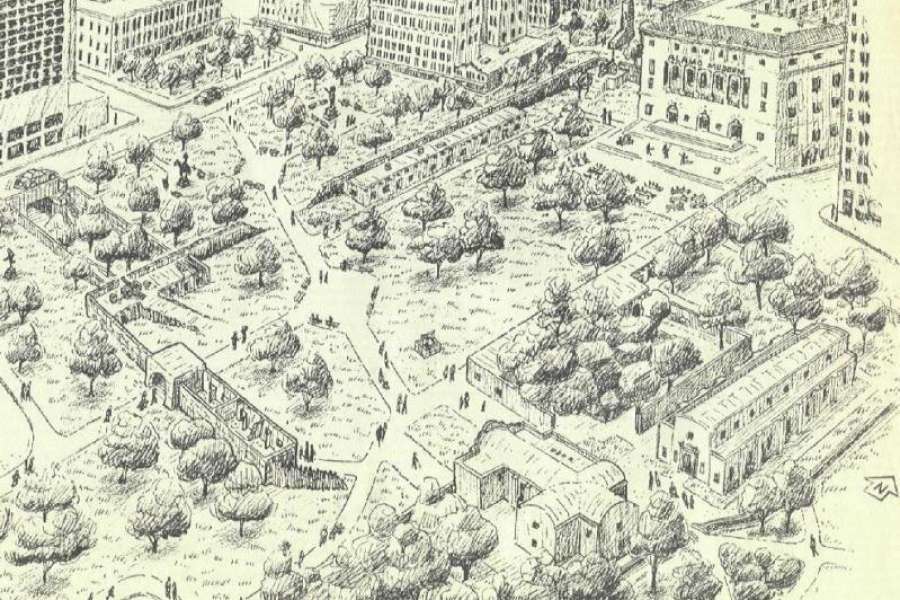 The nearly 100,000 sq. ft. of space that these buildings occupied, as well as their sitting on the fort’s west wall and where Travis’s headquarters had been, was crucial to any redevelopment plans for the plaza.
