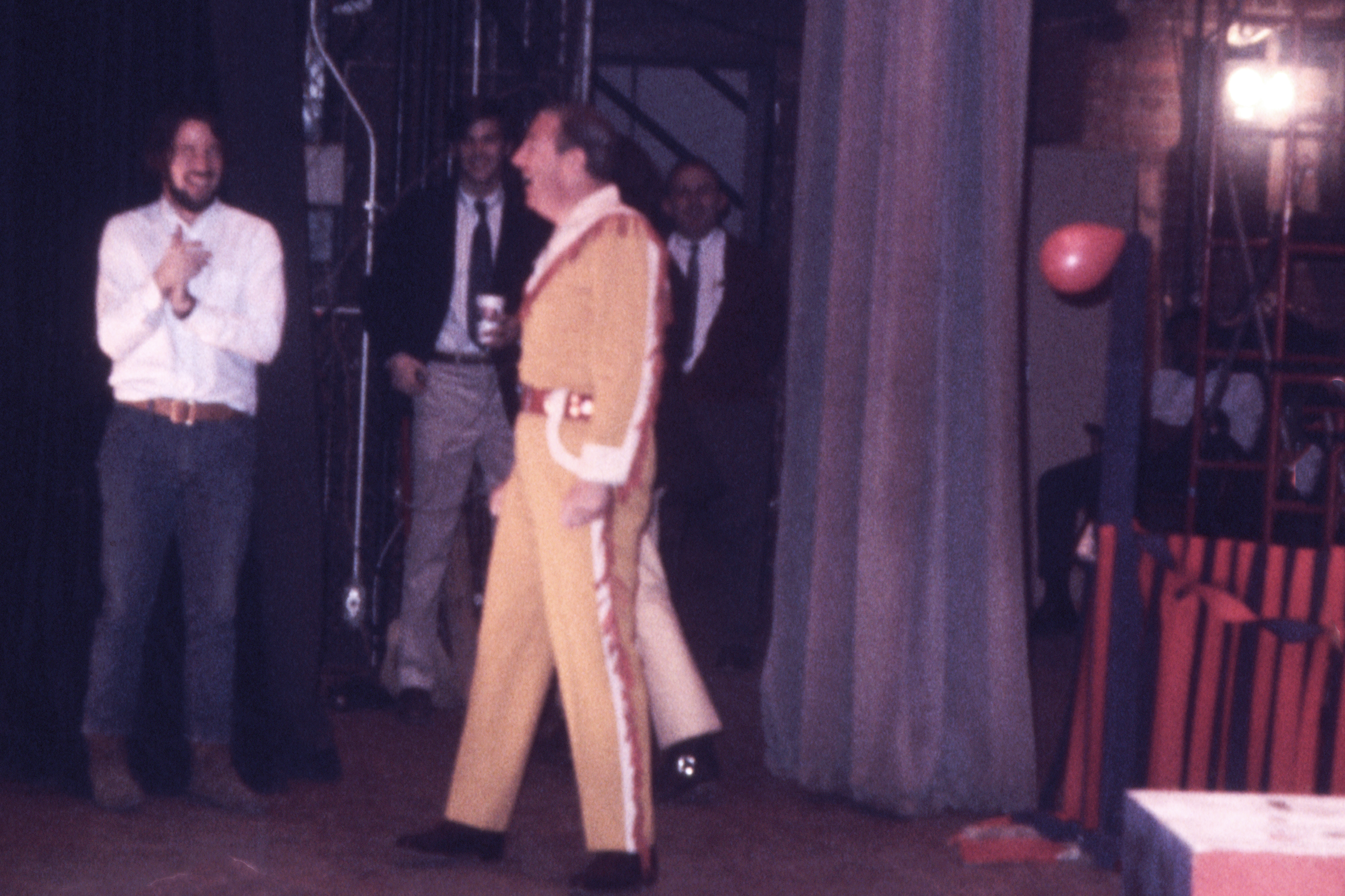 Smith didn’t know what kind of program these college students wanted to see, so he decided to wear his old mustard colored Buffalo Bob suit, play the kinescope of the tenth-anniversary Howdy Doody Show, sing a few songs from the show on a piano, and finish by taking questions.