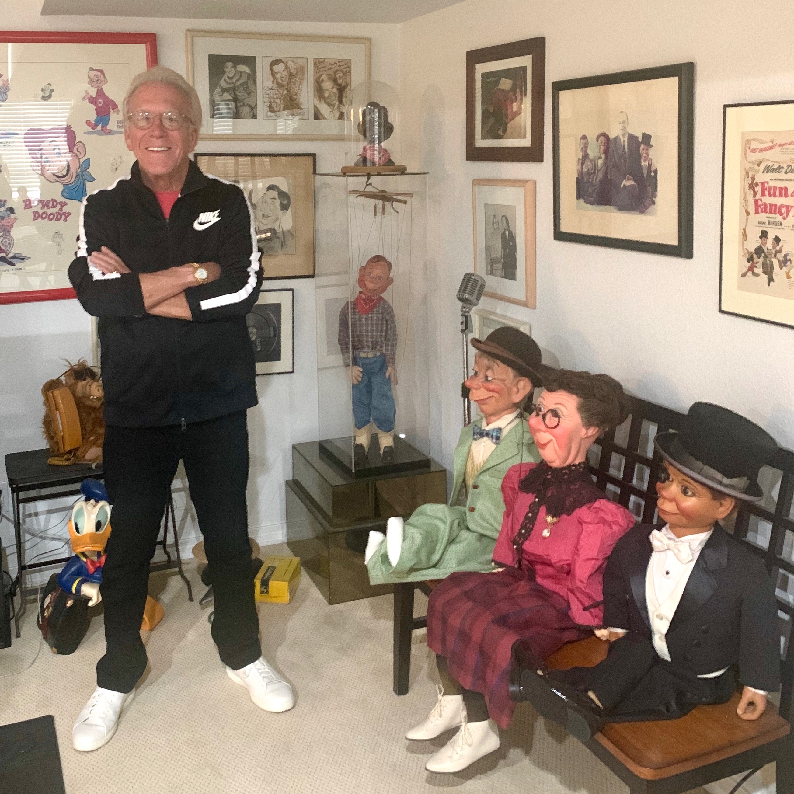 Above everything else, Burt is the quintessential television historian, having a wide collection of television memorabilia, ventriloquist figures, videotapes, and kinescopes. Since he cut his teeth on Howdy Doody, Dubrow has an extensive collection of Howdy Doody items, which includes: one of the few Howdy Doody marionettes made from Velma Dawson’s original, Lew Anderson’s Clarabell costume, his box with its horns attached, and also his seltzer bottle, as well as Buffalo Bob’s mustard colored suit.