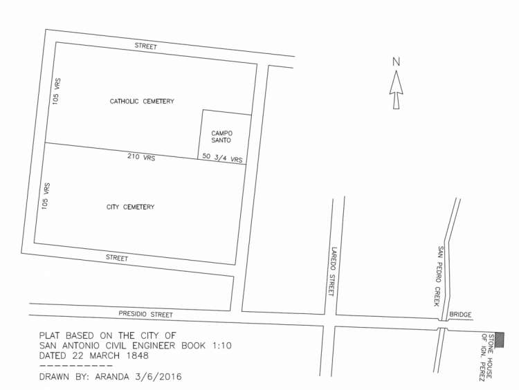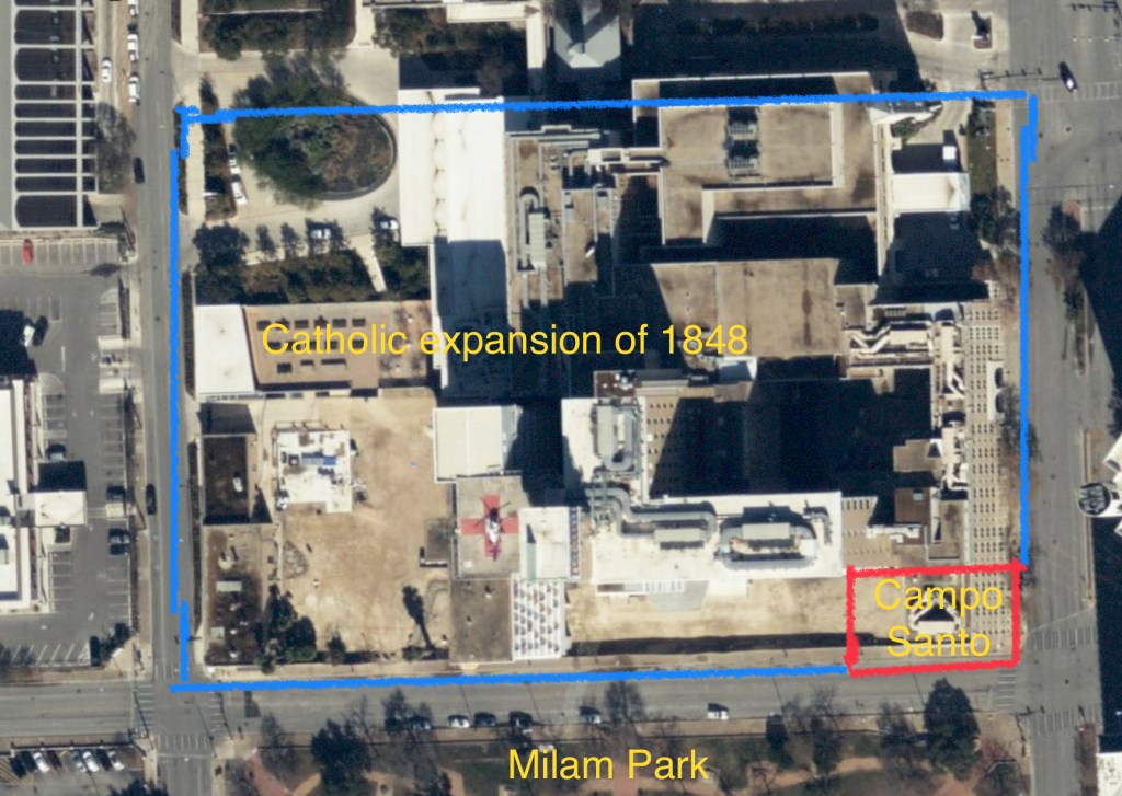 The final approved plan created two sections, each measuring 291.66 feet by 533.32 feet. The north section, including the old Campo Santo, would be used by the church for Catholic burials. This section is now occupied by the Santa Rosa Medical Center and Children’s Hospital of San Antonio. The south section, which is now Milam Park, was set aside for the non-Catholics and was known as the “City Cemetery.” The dividing line between these two sections is roughly where West Houston Street is now. This 1848 plat diagram shows the layout of these two cemeteries.