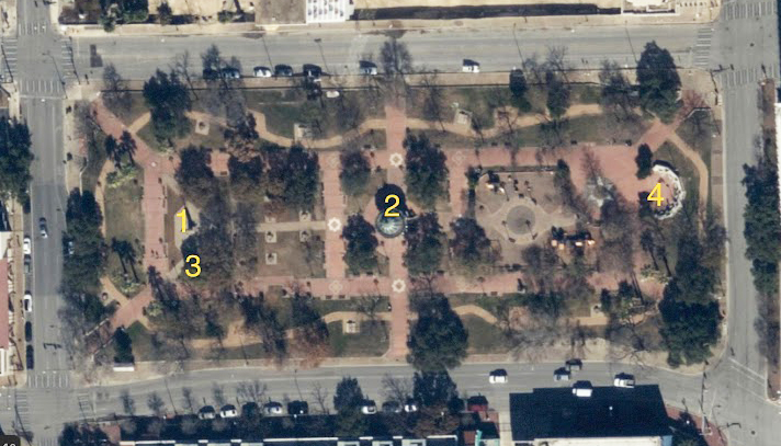 Milam Park locator map: 1. Ben Milam monument and grave, 2. the center of the park with kiosk, 3. location of Milam’s original granite monument, 4. Monument Honoring Early San Antonio Burials.