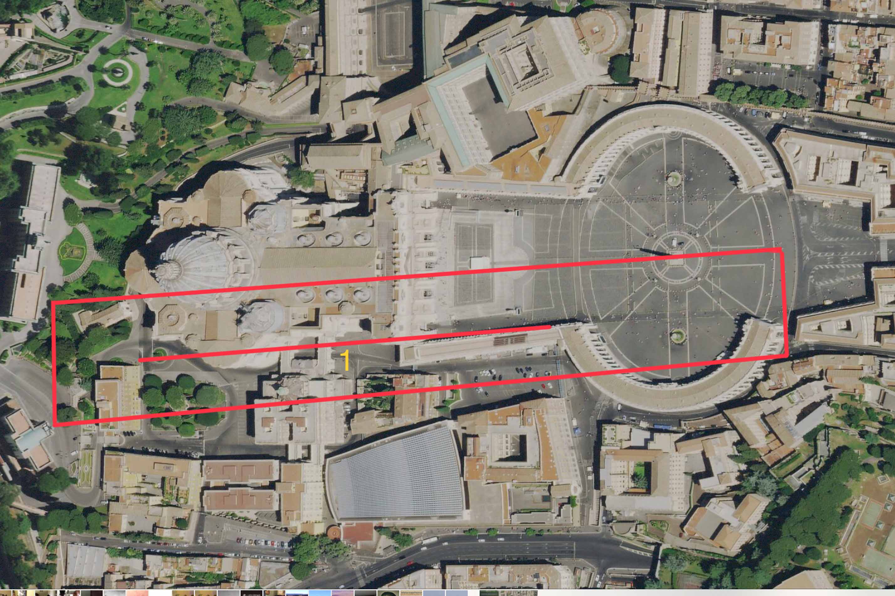 To start we’ll begin on the eastern side of Saint Peter’s Square, where the Via della Conciliazione enters it. In that general location was the eastern end of the circus; it was here where the circus’s starting gates, or its turn, would have been. From this point the circus would have extended west, across the plaza and through the left side of Saint Peter’s, all the way back to the Palace of the Tribunal, that’s behind the Basilica.