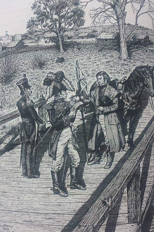 Jim Bowie felt that the young Travis may have acted too hastily. Hoping to defuse what happened, he sent his friend Green B. Jameson out with a letter to Santa Anna. The letter asked if Santa Anna would agree to a parley. At the small footbridge, Jameson met with Colonel Juan N. Almonte, Santa Anna’s Chief of Staff. Almonte, who spoke perfect English, agreed to give the general Bowie’s letter.