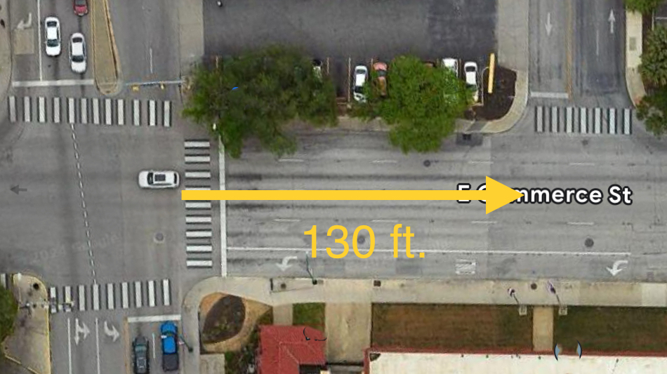 To find the eastern Acequia Madre, I repeated the process I used to find the western Alamo Acequia. On the center section of the map, the common reference point still present today is Bowie Street. Using the map’s scale, I measured east from Bowie to the Alamo ditch. This came to around 130 feet. Returning to the Google map, I measured east from Bowie Street 130 feet along E. Commerce, which took me to Elm Street (Figure 4). Elm Street would have been the Acequia Madre’s location and the Alameda’s general eastern end. But how accurate are my calculations? There was a way to check.