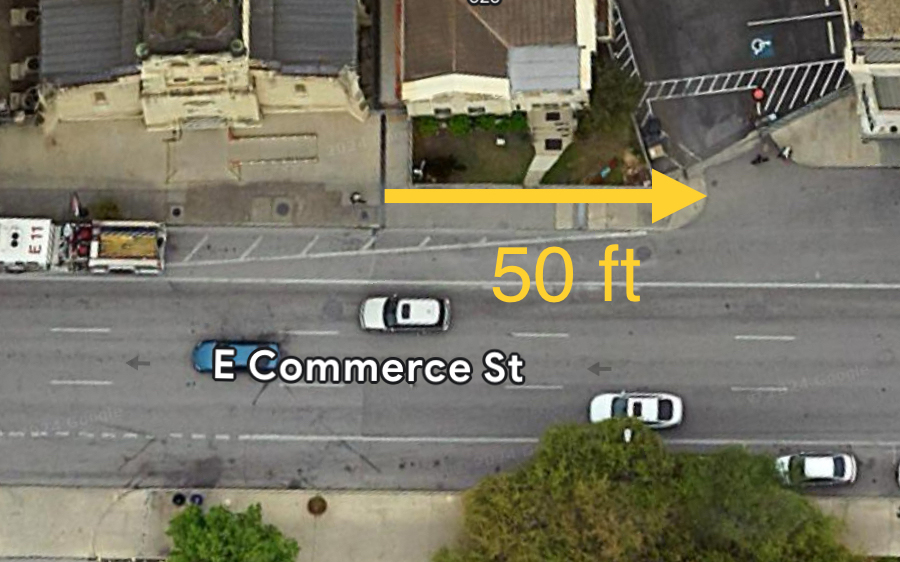 To pinpoint the location of the western irrigation ditch, I needed a reference point that not only appeared on the 1888 map but also exists today. Although Damfino Street is no longer present, St. Joseph Catholic Church remains. Using the map’s scale, I measured east from St. Joseph Church to the Alamo ditch. This distance was approximately 50 feet. I then used the Google satellite map of E. Commerce Street and its measuring tool to move 50 feet east from St. Joseph Church. This led me to a small parking lot east of the church building (figure #3). This would have been the Alamo Acequia’s location and the western end of the Alameda.
